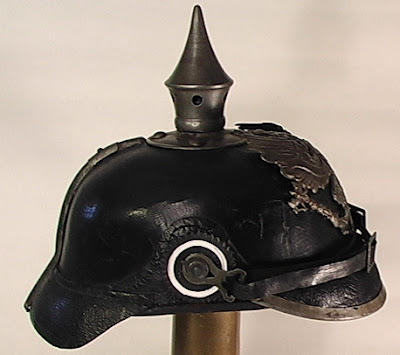When I take this helmet around to school groups, I'll always ask the kids what the spike is for. Invariably, they give the same answer. A fourth grader will bend over and lunge forward in a pantomime of the pointy part's perceived purpose, that is, to charge the enemy soldier and stab him (or at least freak him out) with the deadly spike. After congratulating the kid on a fine and reasonable guess I then reveal the very mundane point of , er, the point.